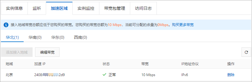 購買業(yè)務所需要的實例后,您便可以添加加速區(qū)域,指定IPv6客戶端所在地域并為其分配帶寬,同時獲得加速IP。