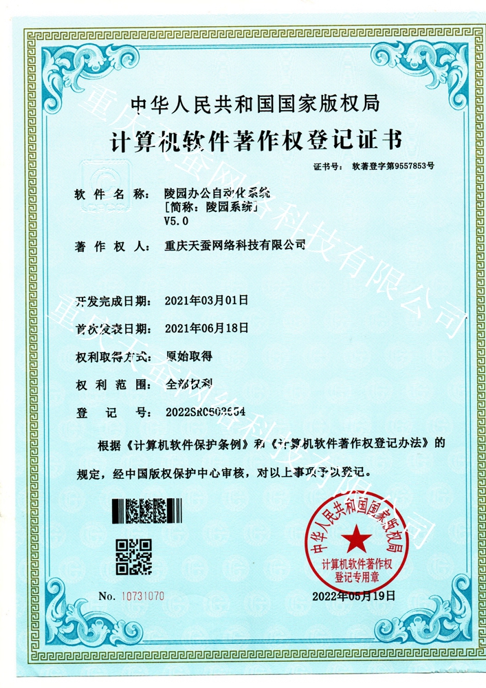 天蠶重慶軟件開發(fā)公司編者語:我司開發(fā)完成的自主知識(shí)產(chǎn)權(quán)“陵園辦公自動(dòng)化系統(tǒng) V5.0 簡(jiǎn)稱‘陵園系統(tǒng)V5.0’ ”(英文:Cemetery Office Automation Manage System  V5.0,簡(jiǎn)寫COAMSV5.0:),陵園系統(tǒng)V5.0在2021年3月開始開發(fā),2021.6月開始發(fā)布,經(jīng)中華人民共和國國家版權(quán)局版權(quán)保護(hù)中心嚴(yán)格審核后,于2022年5月19日取得了《計(jì)算機(jī)軟件著作權(quán)登記證書》。